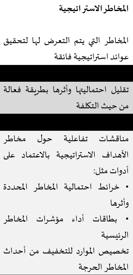 وبالنسبة للمخاطر الاستراتيجية فيجب على الشركات تصميم مناهج تتناسب مع نطاق المخاطر التي تنطوي عليها ومعدل التغيير فيها. وعلى الرغم من أن وظائف إدارة المخاطر قد تختلف من شركة إلى أخرى، إلا أن كل هذه الجهود يجب أن ترتكز على عمليات التخطيط الاستراتيجي للشركة.