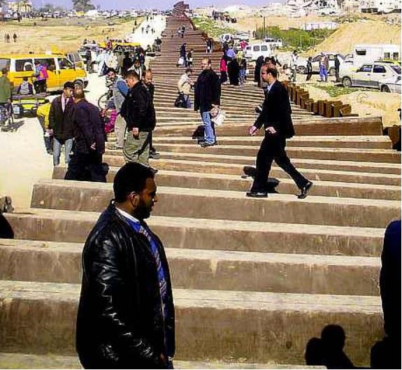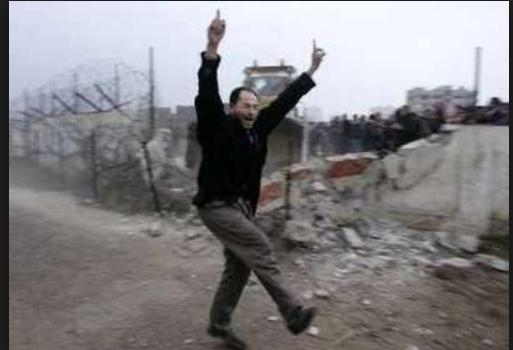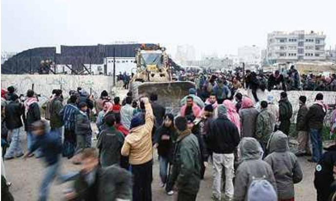 وقت النكسه فبدات الجرافات على المعبر تسوي بالارض ما تبقي من الجدارالصور أعلاه نرى رقصة العبور .... بفرحة كما لو كان استعاد القدس وليس تعدى على حدودنا