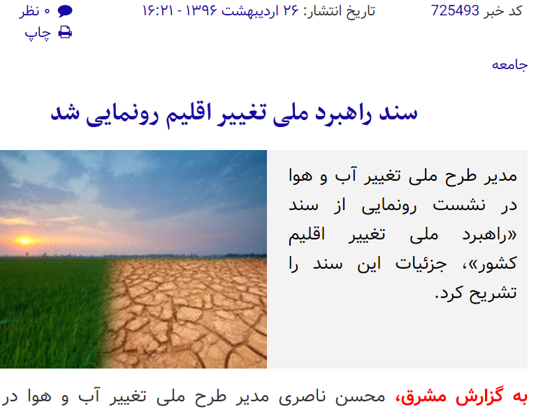 1/12. در 1396، سازمان محیط زیست، برنامهء راهبرد ملی تغییر اقلیم را تدوین کرد، که به گفتهء ناصری، مدیر این برنامه، یک برنامهء 5 ساله بوده، لذا در 1401 خاتمه یافته است. ناصری در مراسم رونمایی از این برنامه گفته بود: «زمانی متوجه شدیم که⬇️