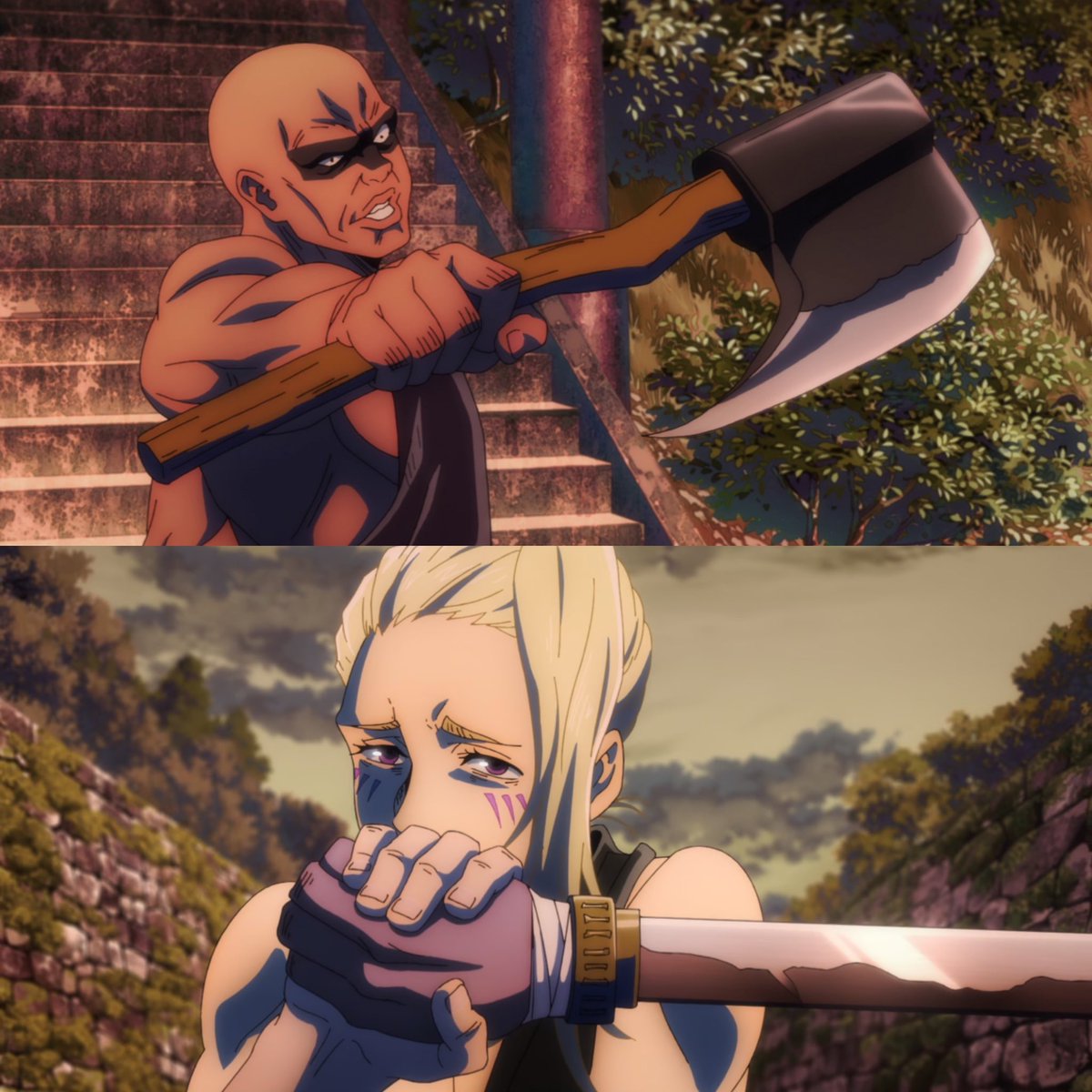 كيف نوبارا ما قدرت تجاري المستفز ؟ شي غريب جدا وتوقعت إنها راح تستطيع إصابته بهجوم واحد على الأقل لكن اللي شفته العكس تماما، مادري هل هو قوي لهذه الدرجة أم نوبارا كانت متساهلة معاه وإغترت بنفسها، سيفه يعتبر أداة ملعونة، وسيفه صنعه له جوزو اللي ظهر لنا بأرك التبادل، ايضا إتضح لنا إنه مو فاهم طريقة عمل تقنيته، امور معقدة كثيرة