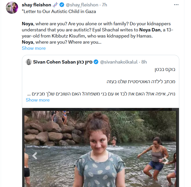 "JK Rowling retweets a post highlighting the plight of Noya Dan, a 12-year-old Israeli girl with #autism held hostage by terrorists in Gaza who was a big Harry Potter fan."