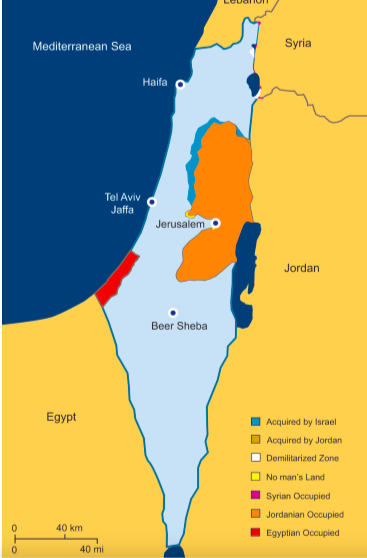 The armistice lines of 1949 established that the #WestBank would be under Jordanian control, and the #GazaStrip under Egyptian control. The remaining territories were incorporated into Israel. These borders held until the 1967 Six-Day War