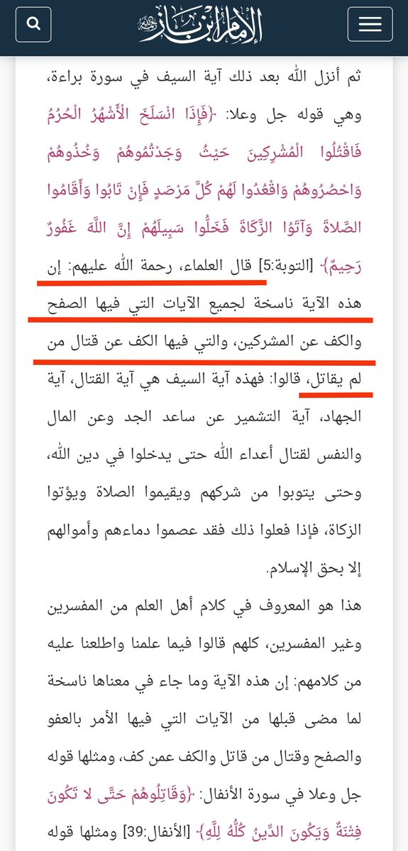 أما من يستدل بآيات مثل: (وَقَاتِلُوا فِي سَبِيلِ اللَّهِ الَّذِينَ يُقَاتِلُونَكُمْ وَلَا تَعْتَدُوا ۚ) وما يشبهها، فقد إتفق العلماء أن هذه الآيات منسوخة، أي تبدل حكمها وكانت في بداية الإسلام لأن المسلمين ما زالوا ضعفاء.
