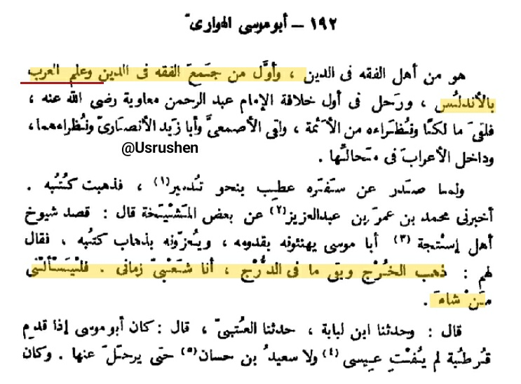 ▪︎حيث يقول الزبيدي الآندلسي :"" ابو موسى الهواري هو من اهل الفقه في الدين ، و اول من #جمع_الفقه في الدين و #علم_العرب بالاندلس""