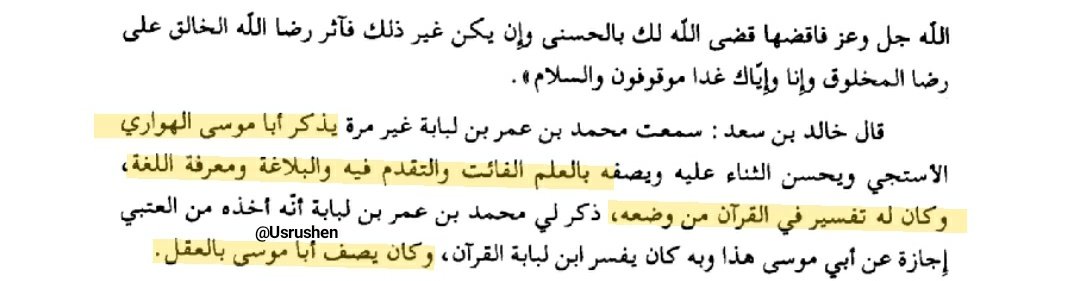 ▪︎قال خالد بن سعد : ""سمعت محمد بن عمر بن لبابة غير مرة يذكر أبا موسى الهواري الاستجي ويحسن الثناء عليه ويصفه #بالعلم_الفائت والتقدم فيه و #البلاغة و #معرفة_اللغة وكان له #تفسير_في_القرآن من وضعه وكان يصف أبا #موسى_بالعقل"".