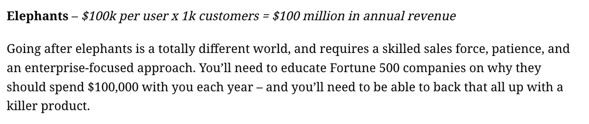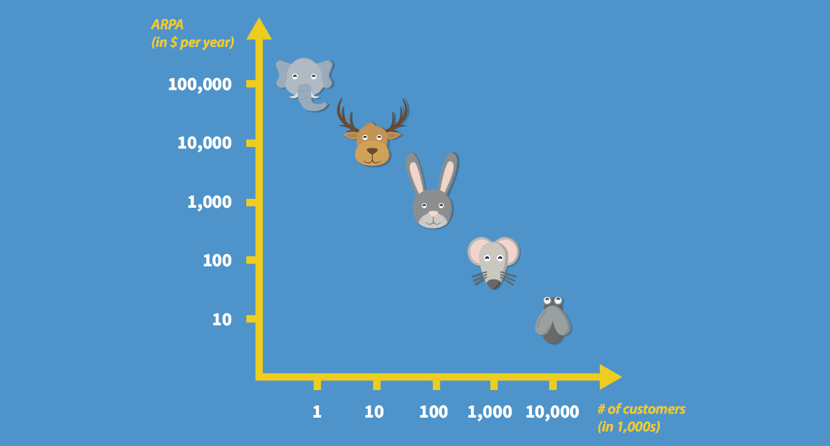 وقد تحتاج إلى عدد كبير للوصول إلى 100 مليون دولار ولكن في هذه الحاجة نحتاج إلي عدد قليل من العملاء فهذا يعني تأسيس مشروع تقني عملاق يستحق الدفع مبلغ كبير سنويا ولا تستطيع الشركات وحدها بنائه من أجل التوفير وانخفاض مصاريف التسويق فنحن نحتاج إلى عدد قليل من العملاء والعكس صحيح