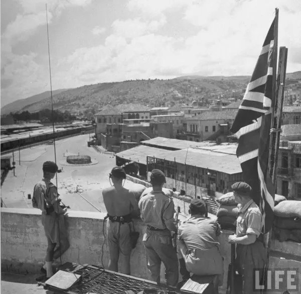 -مشاة البحرية البريطانية يحرسون شارعا فلسطينيا مهجورا في حيفا