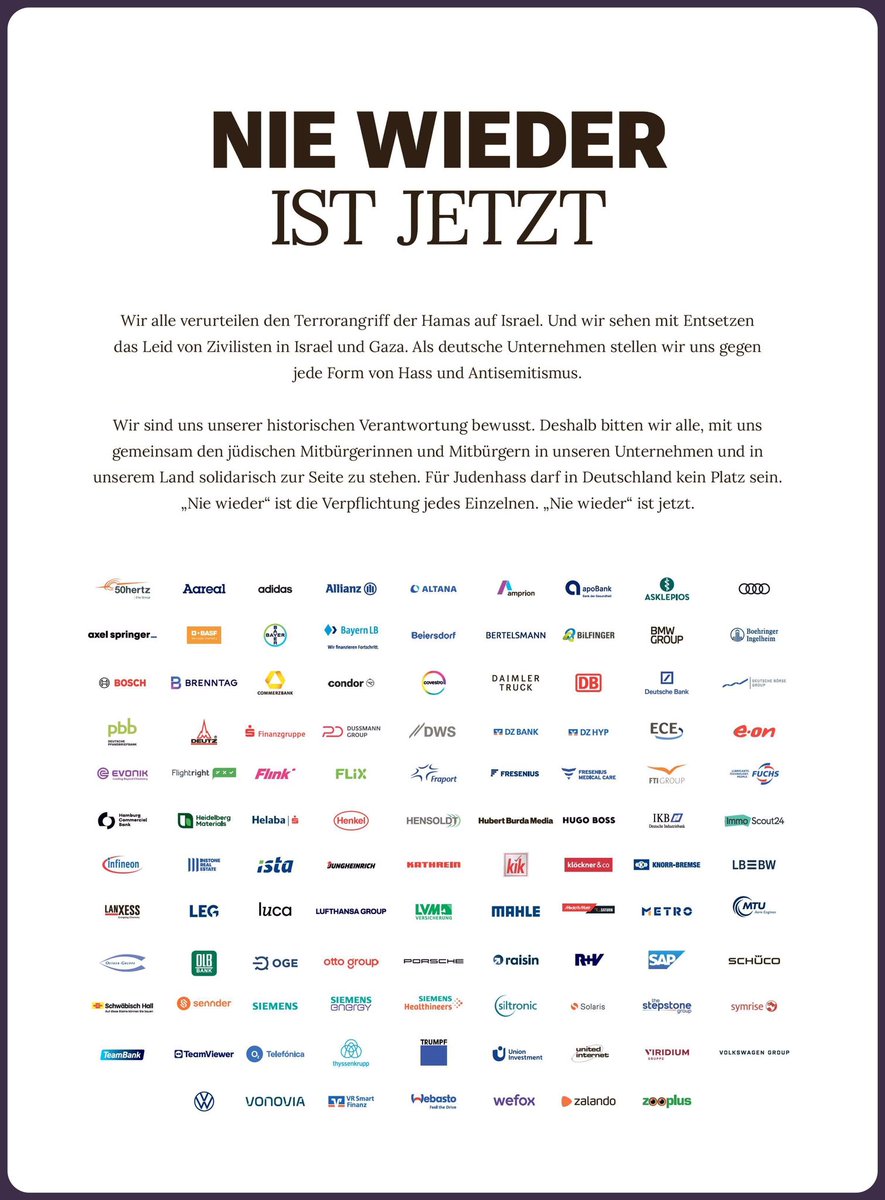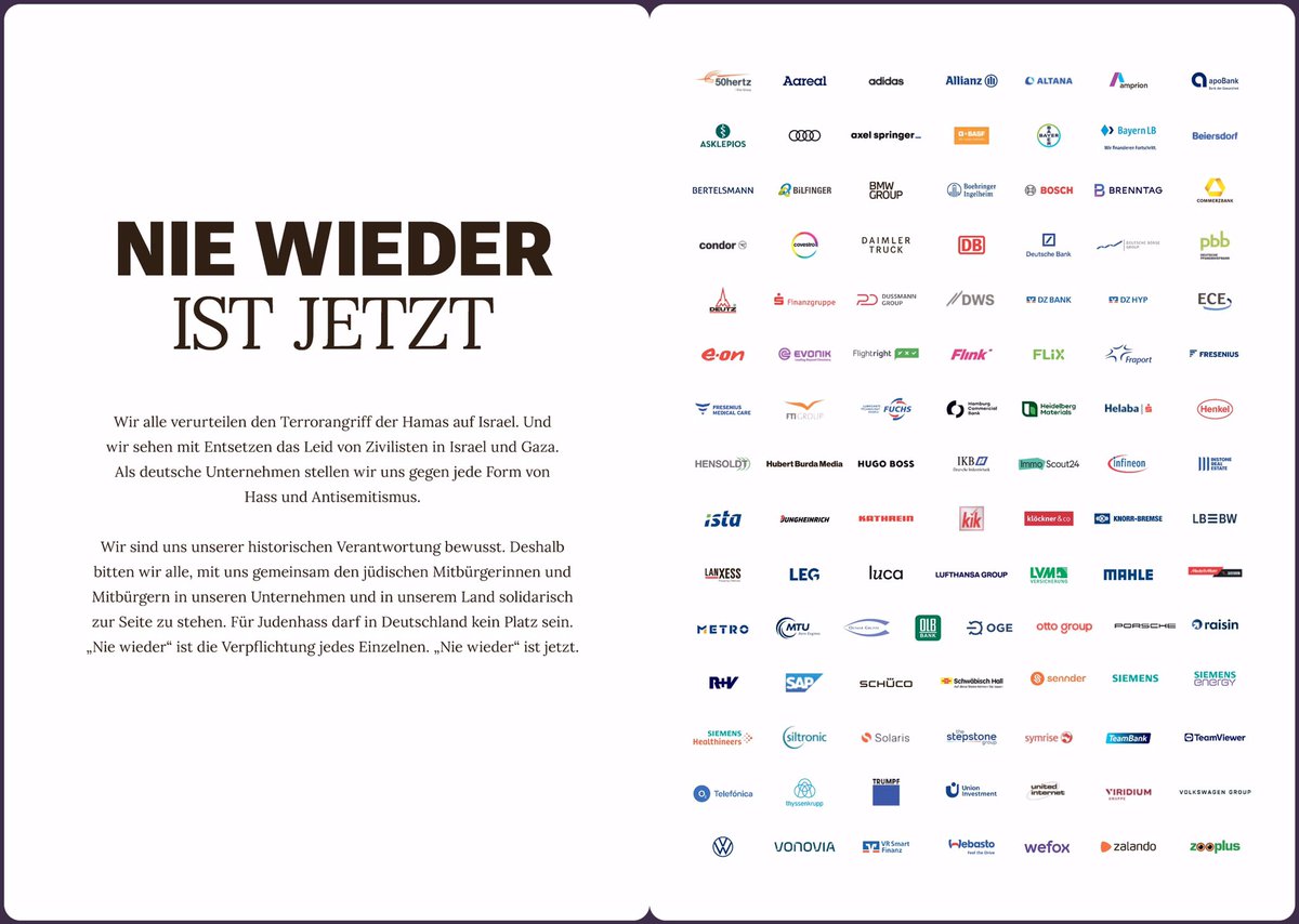 106 شركة ألمانية أصدرت إعلانا مشتركا الأحد الماضي، في 3 صفحات كاملة بجريدتي "Welt" و "Bild" بعنوان ( لن يحدث ذلك أبدا مرة أخرى ) جاء فيه: