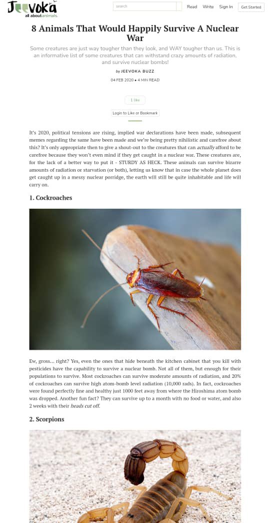 بقدر ما تشعر بالإشمئزاز من هذه الحشرات، لكن حتى تلك التي تختبئ أسفل خزانة المطبخ ويمكنك قتلها بالمبيدات الحشرية قادرة على النجاة من انفجار نووي! بالتأكيد ليس كل الأنواع، لكن سينجو ما يكفي لإنشاء مستعمرة جديدة ! يمكن لمعظم الصراصير البقاء على قيد الحياة بكميات معتدلة من الإشعاع، ويمكن أن تنجو 20% منها بمستويات عالية من الإشعاع الذري “حتى 10000 راد”. في الواقع، تم العثور على صراصير بحالة جيدة على بعد 1000 قدم فقط من مكان سقوط قنبلة هيروشيما الذرية الغريب أيضًا أن بإمكان هذه الحشرات البقاء على قيد الحياة لمدة تصل إلى شهر بلا طعام أو ماء، وأيضًا حتى أسبوعين من قطع رؤوسهم!