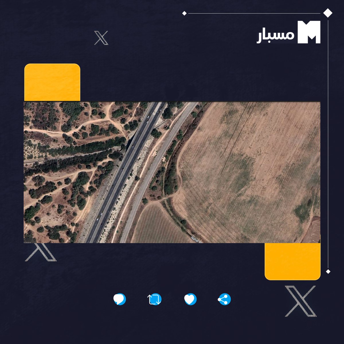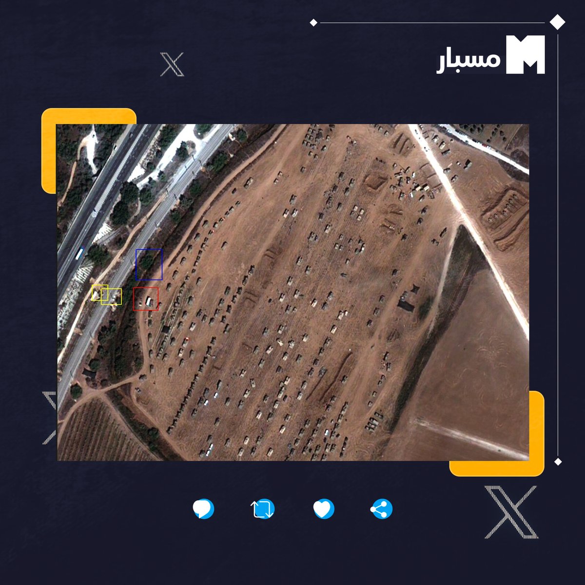 وقبالة موقع الساحة الترابية في #عسقلان، عثر مسبار على كتل من البيوت البلاستيكية، واحدة منها تقع قبالة طريق ترابي وتتكون من 13 بيتًا. وبحسب صورة الموقع عبر الأقمار الصناعية يظهر طريق فرعي نحو اليمين بين كتلتين من الأشجار، وهو الطريق نفسه الذي يسلكه رتل الدبابات في المقطع المتداول.