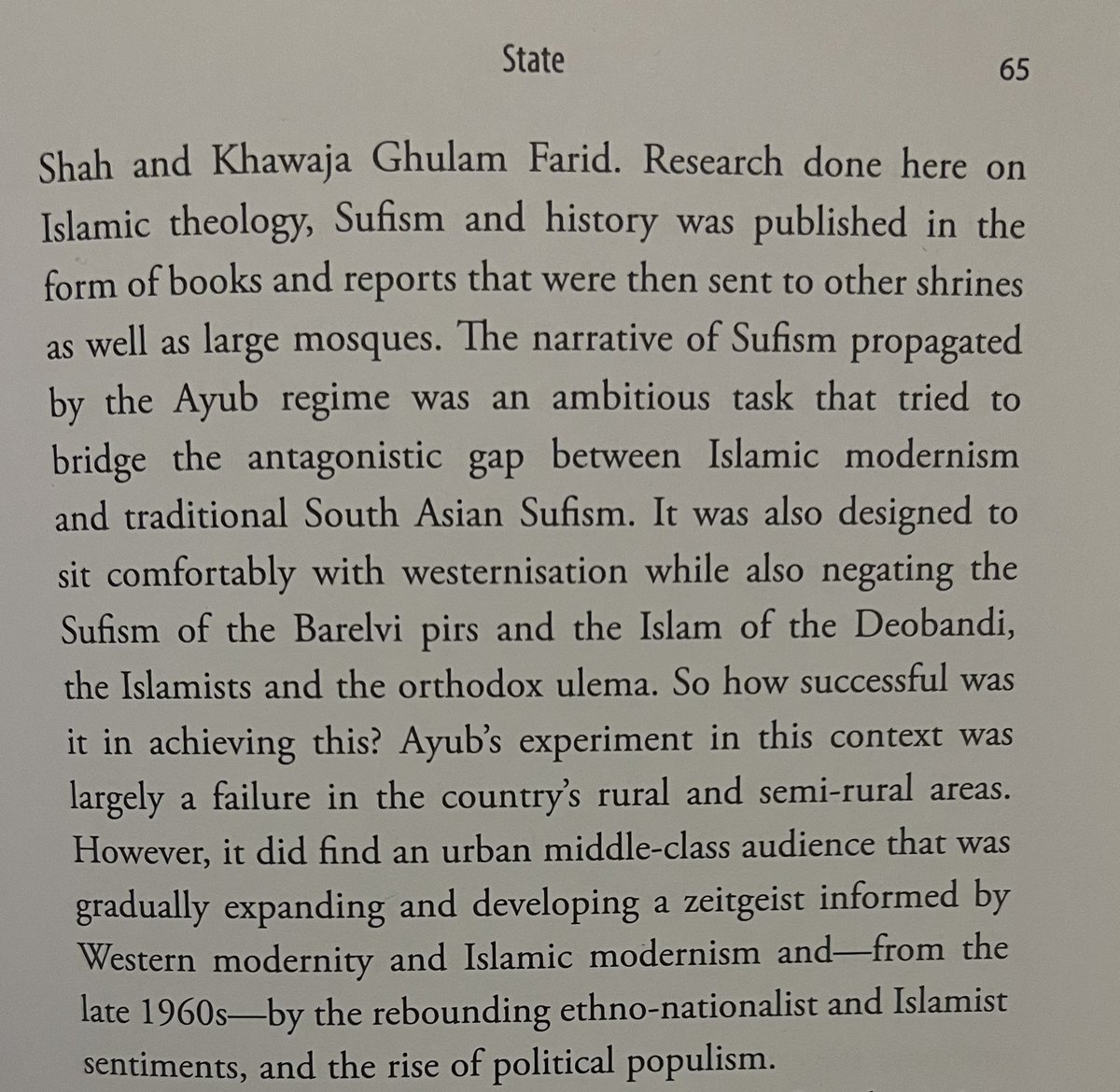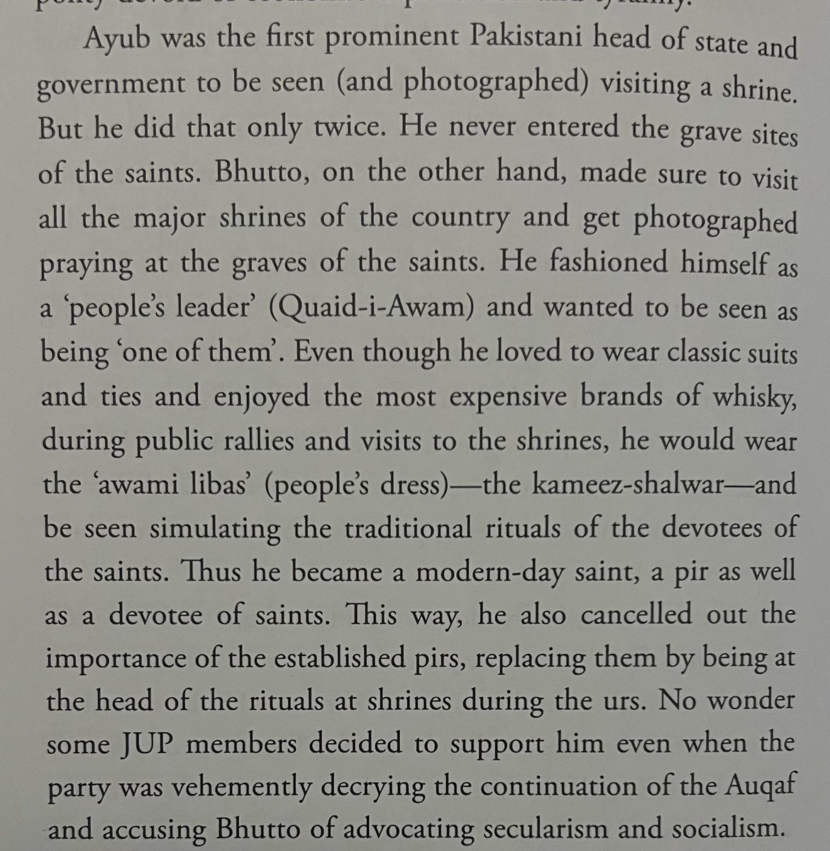 When Ayub khan, through the help of scholars like Fazlur Rahman imported a 'Modernization' of 'radical' Islam in full swing to 'appease' the west, later political leaders like Bhutto tried (exploiting) forming their own understanding of sufism,