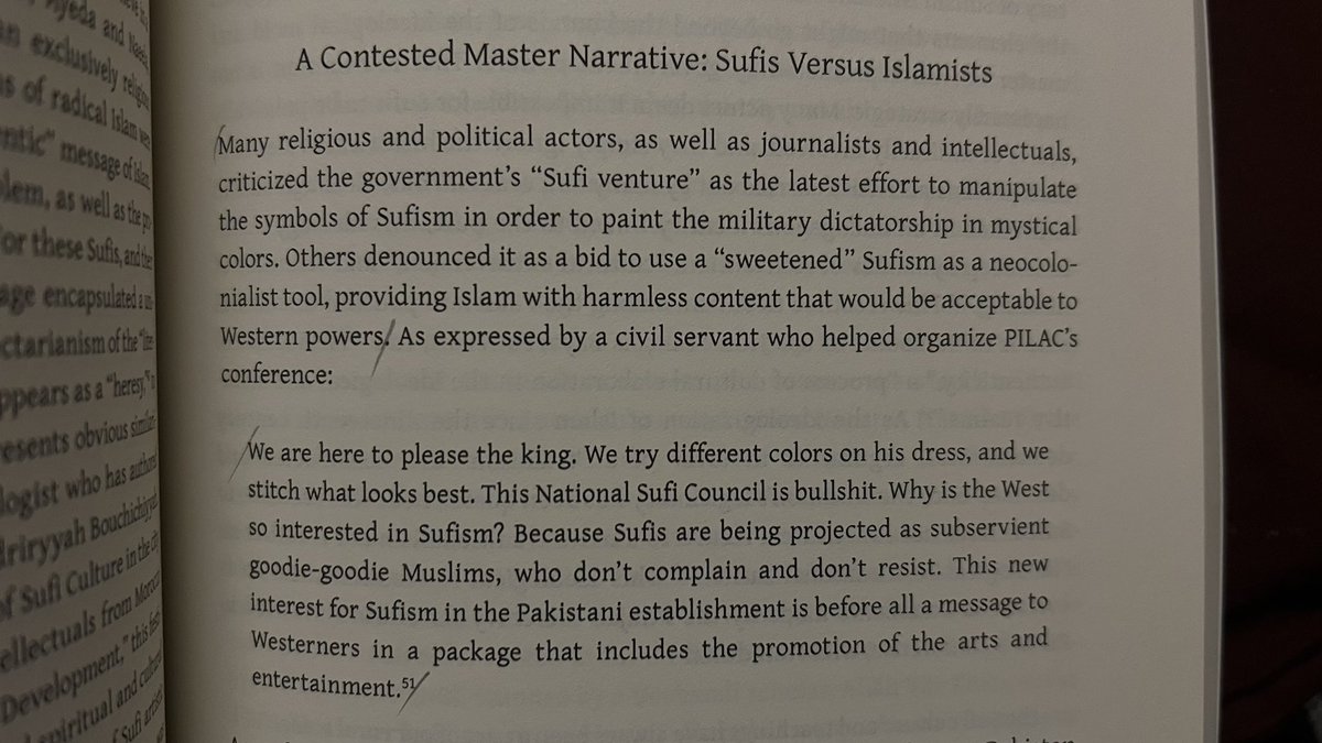 Although many not be aware but this political exploitation of sufism was not actually original of pakistan but in fact imported. The west, looked at sufism from a certain perspective, and decided to establish it as that only, in order to "rethink" Islam for modern times.