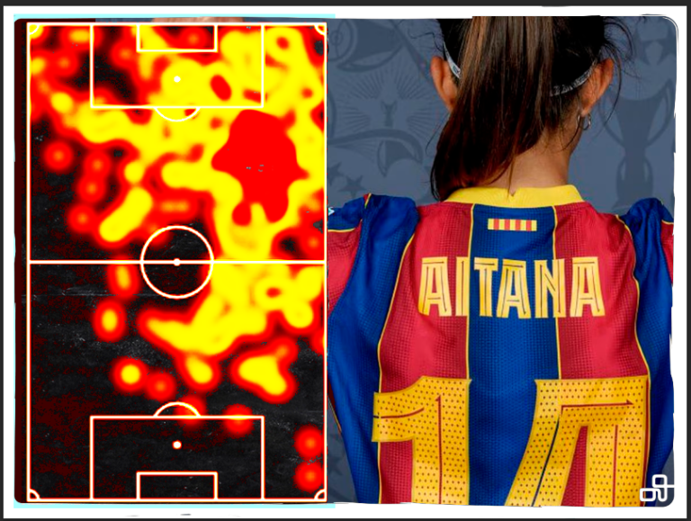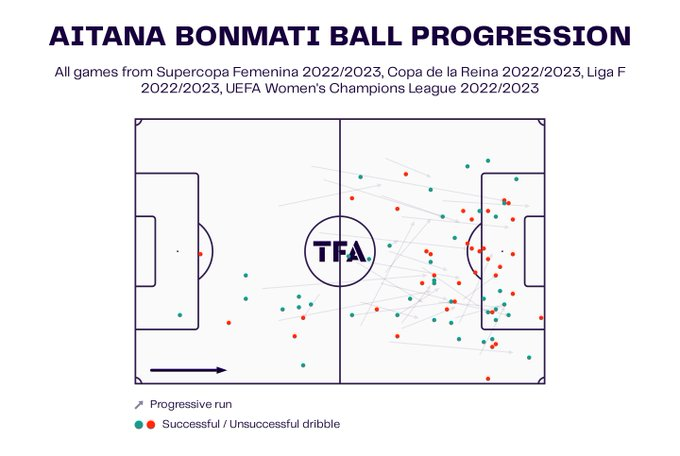 Entre Liga y Champions, @AitanaBonmati marcó 14 goles (segunda del equipo) y dio 18 asistencias (la que más). La catalana no solo contribuye en ofensiva, sino que también domina los duelos, un 58% de los duelos terrestres y un 54% de los aéreos.