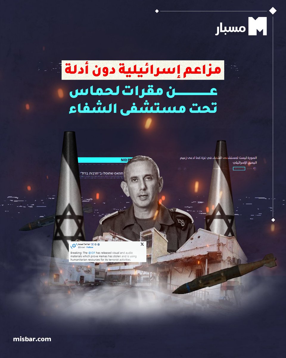 بدون أدلة.. ادّعاءات إسرائيلية تدّعي وجود مقرات لحركة حمـــ.اس داخل وتحت #مستشفى_الشفاء، بينما نفت حركة حمـ|س ادّعاءات الاحتلال معتبرة إياها ادعاءات إجرامية وخطيرة وتمهد لاستهداف المستشفى.