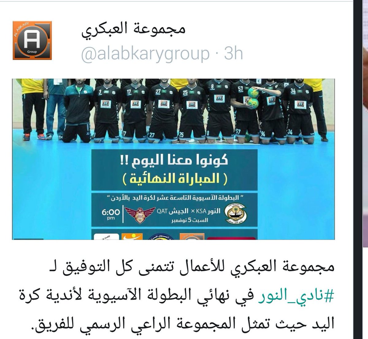 بدأت المباراة النهائية بين #نادي_النور_السعودي ونادي #الجيش_القطري وكانت مباراة تاريخية بشهادة الجميع ، ماانجلت الغبرة الإ تم إعلان بطل جديد لآسيا ، هو أكاديمية النور، مهد الذهب، ونواخذة اليامال،