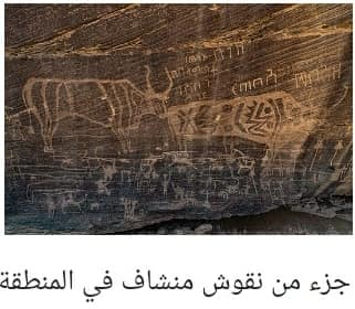 من ضمن النقوش لوحة صخرية عملاقة بها عددٌ من الرسومات والكتابات والنقوش الأثرية التي يعود تاريخها إلى 4 آلاف سنة،
