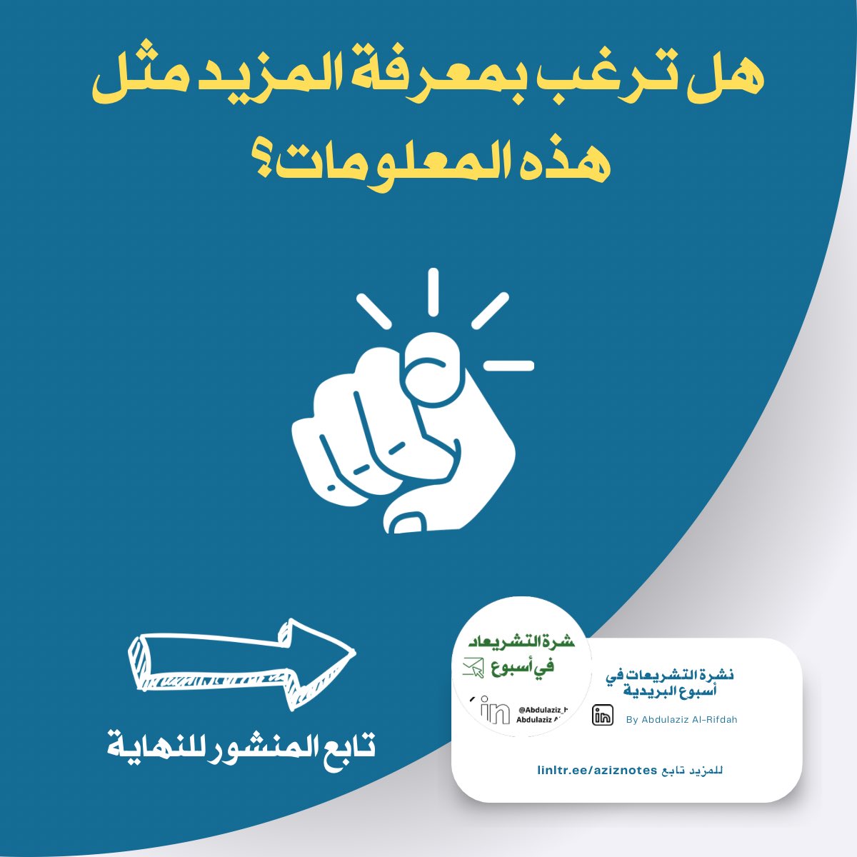 يمكنك ذلك الآن بمتابعة نشرة التشريعات في أسبوع وذلك بتسجيل بريدك الإلكتروني ليصلك صباح كل يوم أحد عبر الرابط 📫.