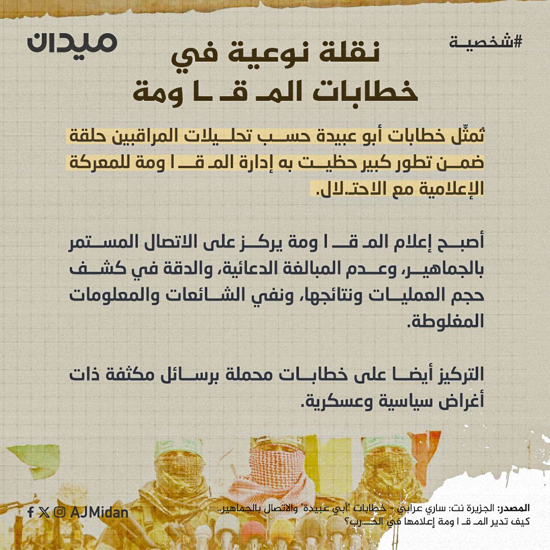 كُني بأبي عبيدة تيمُّنًا بالصحابي #أبو_عبيدة بن الجراح، الذي فُتحت على يديه القـ.دس في عهد #الخليفة عمر بن الخطاب، تنتشر خطاباته بين ملايين خلال دقائق من عرضها، وتحول عند كثيرين -منذ السابع من أكتوبر/تشرين الأول- من أحد قادة كــ.ـتـ.ائـ ب القــ. سـ .ــا م والمتحدث الرسمي لها إلى أيقونة للمقــ. اومة، وقائد للمــ. عــ ركة النفسية ضد الاحــ تـ لال، ورغم كل ذلك، فلا أحد يعرف شيئا عنه تقريبا.. ولا حتى ألد أعدائه من أصحاب المهارات الاستخباراتية الفائقة، فماذا نعرف عنه؟ وكيف مثلت خطاباته نقلة نوعية في أداء المــ. قــ.اومة إعلاميا؟