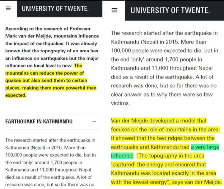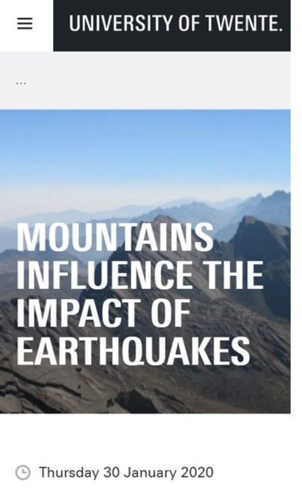 According to the research of Professor Mark van der Meijde, mountains influence the impact of earthquakes. It was already known that the topography of an area has an influence on earthquakes but the major influence on local level is new. The mountains can reduce the power of
