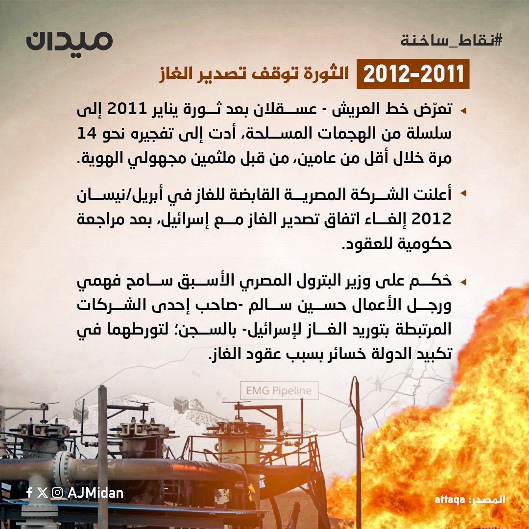 كان المصريون على موعد مع توديع فصل صيف طويل عانوا فيه من انقطاع متواصل للتيار الكهربائي، ومع انحسار موجات الحرارة واقتراب الشتاء، فوجئ الجميع بزيادة عدد ساعات الانقطاع، هذه المرة بسبب قطع #إسرائيل لصادراتها من الغاز ل #مصر بسبب حربها على غ..زة، ليثير ذلك ذاكرة المصريين حول العلاقة الشائكة بين الطرفين فيما يتعلق بتصدير واستيراد الغاز، فما أبرز محطات ذلك الملف؟