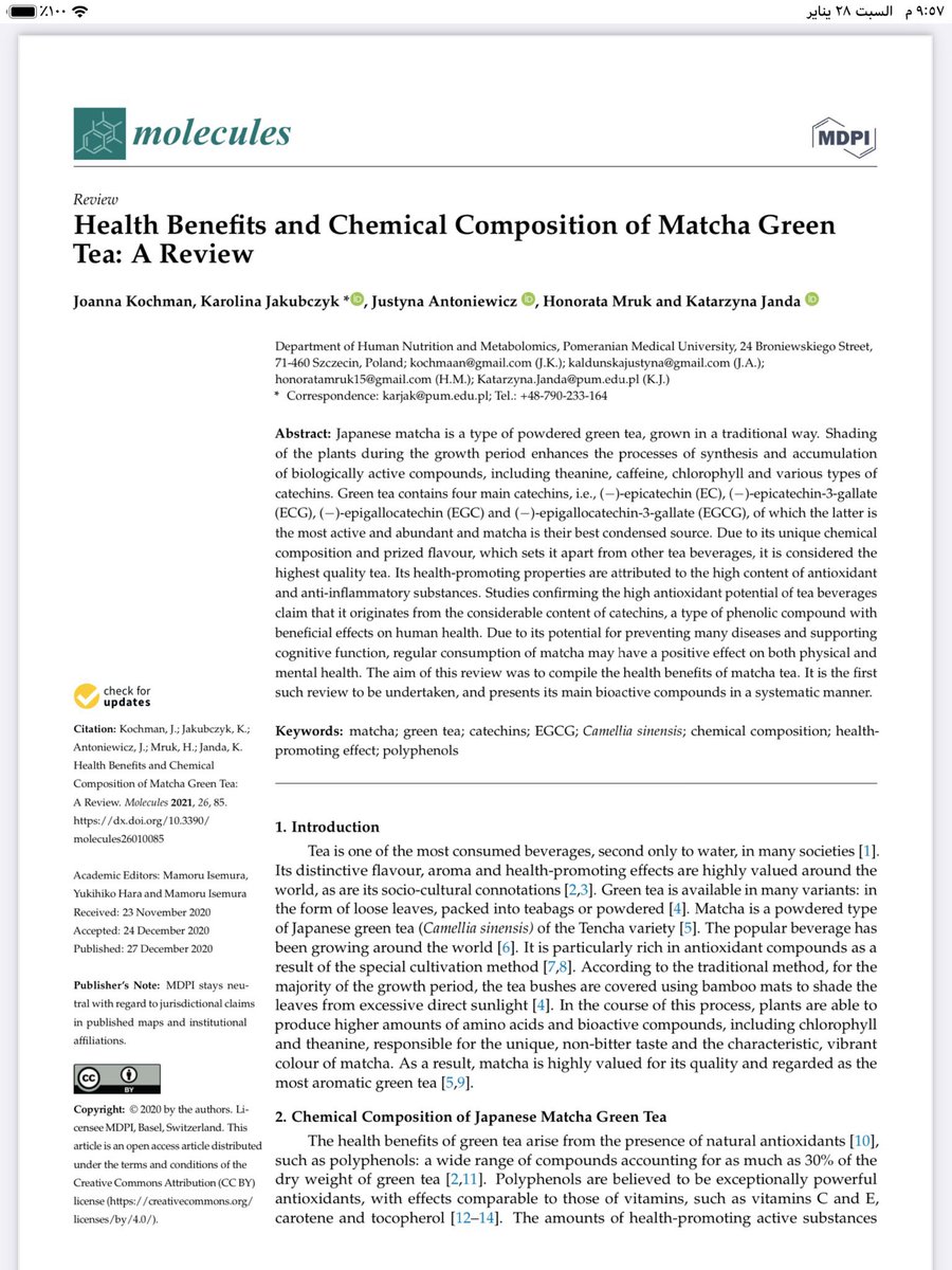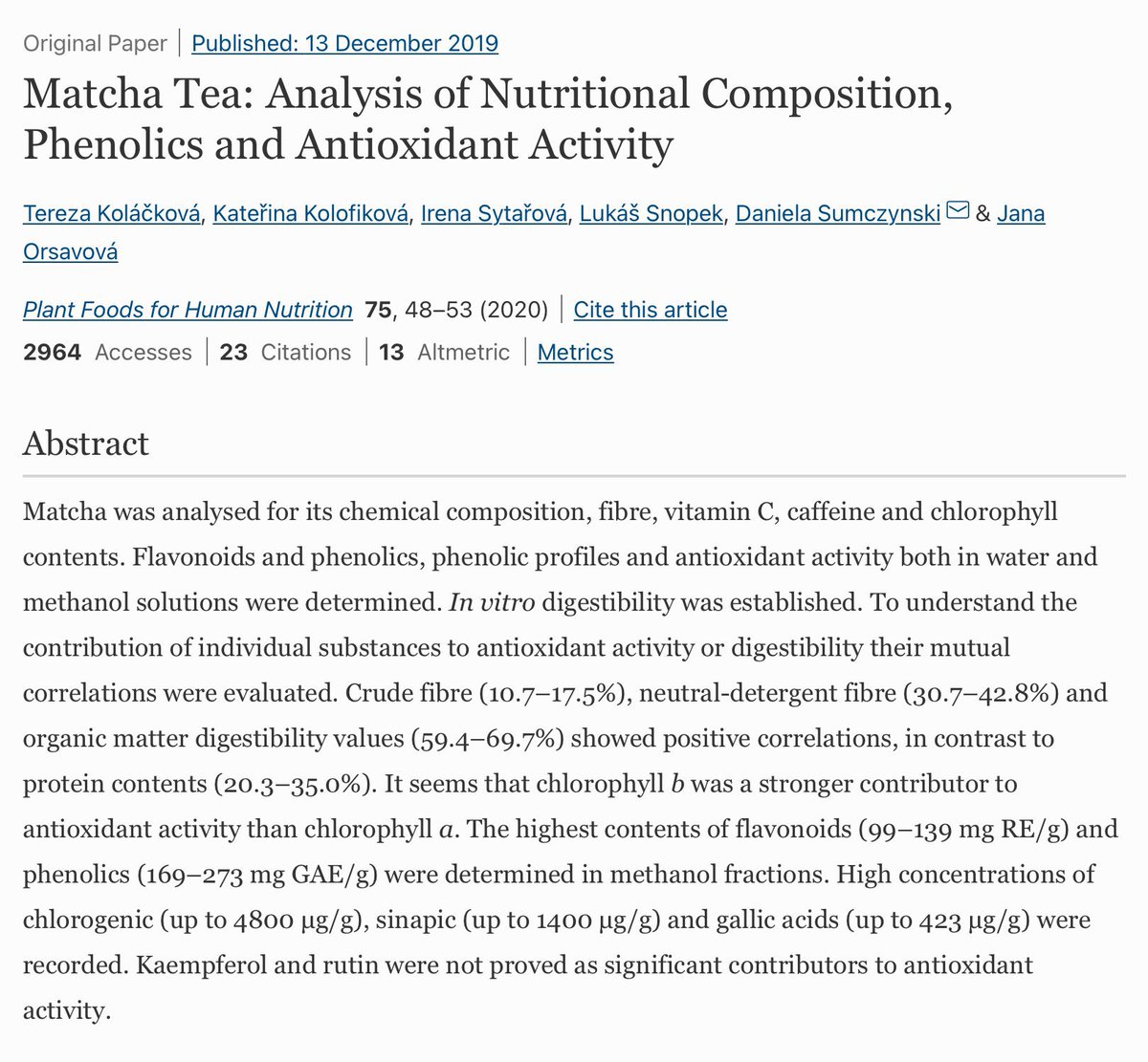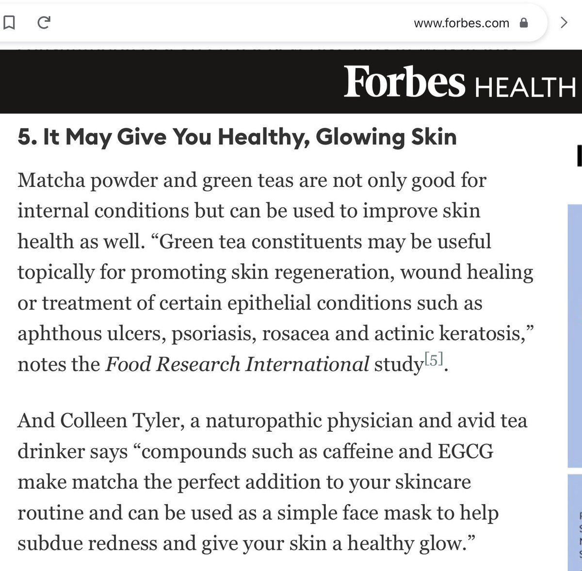 يحتوي شاي الماتشا على العناصر الغذائية من أوراق الشاي بأكملها، مما ينتج عنه كمية أكبر من الكافيين ومضادات الأكسدة مقارنة بالشاي الأخضر.