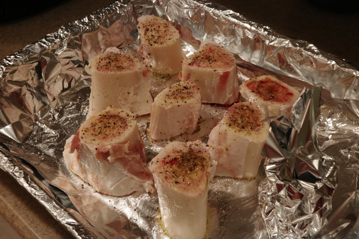 للزبدة اخذت عظم فخذ كامل وطلبت من اللّحام يقطعه لي على شكل أسطوانات وبأطوال متقاربة. ريشته بزيت زيتون وملح وفلفل اسود وأعشاب إيطالية. حطيت بجنبه راس ثوم وعاملته نفس المعاملة ولفيته بقصدير حتى يدخل الفرن مع العظم.