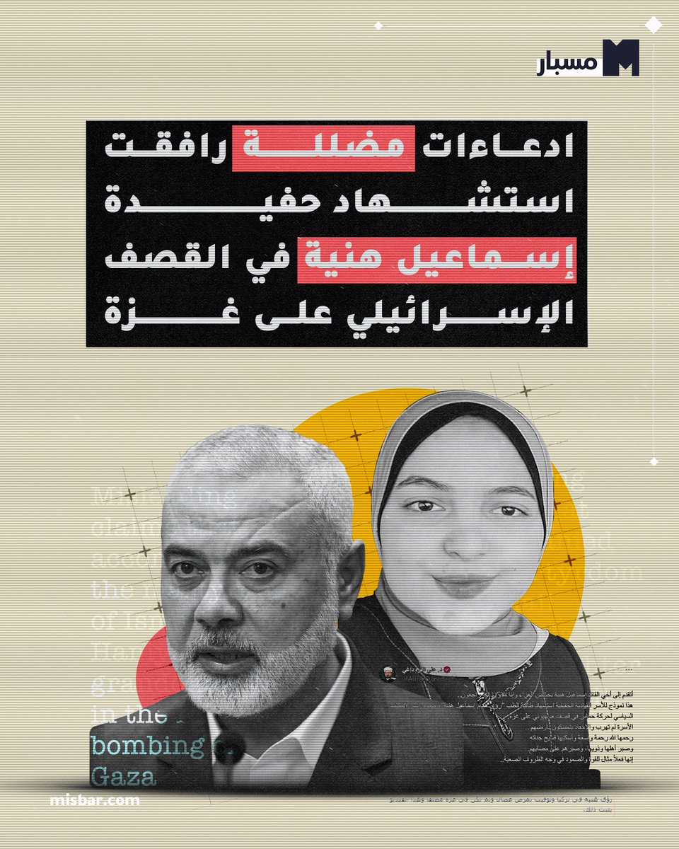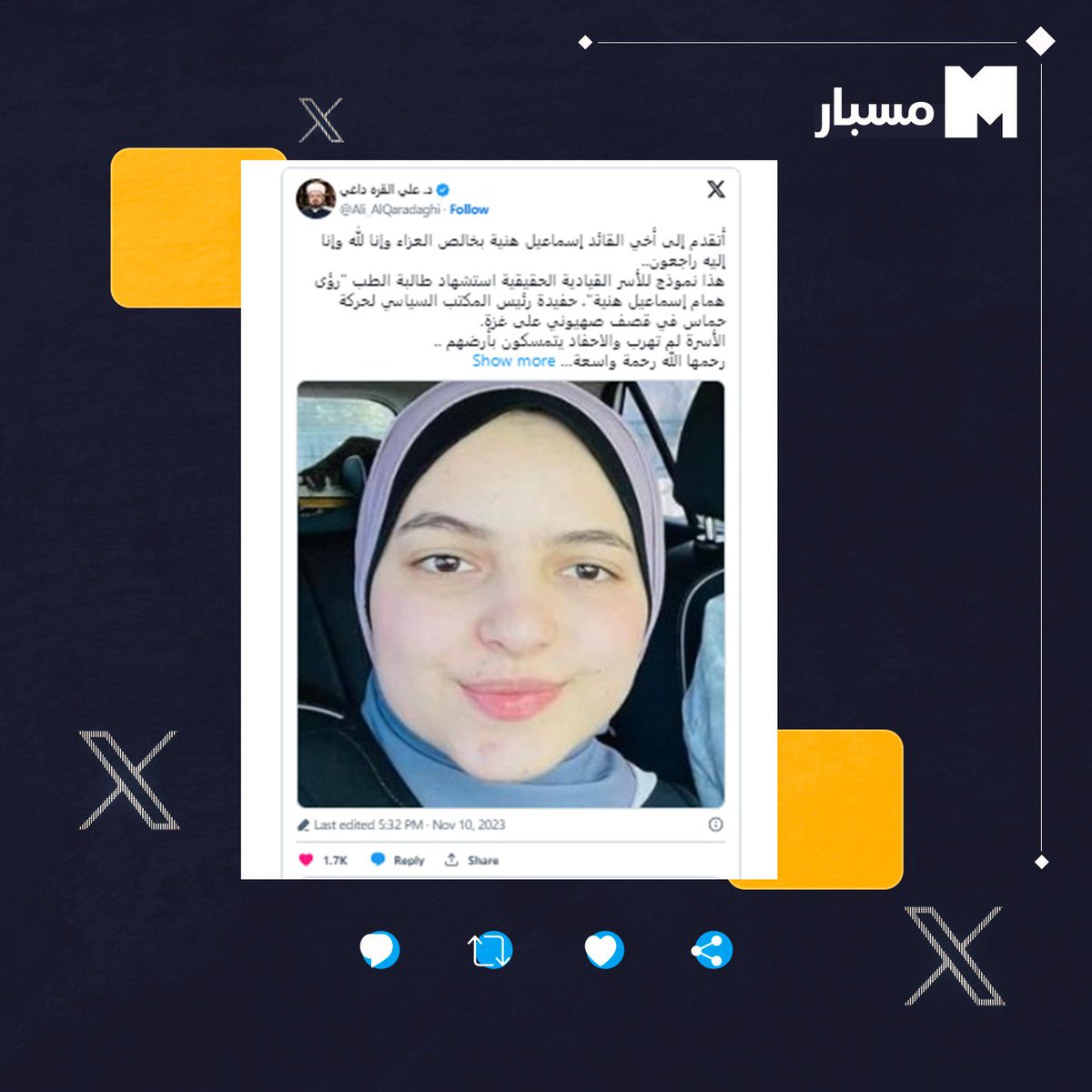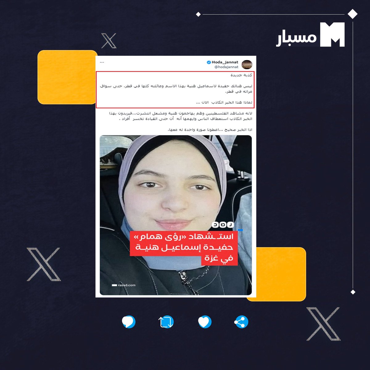 ادعاءات مضللة انتشرت على مواقع التواصل الاجتماعي، بعد إعلان استشهاد حفيدة رئيس المكتب السياسي لحماس #إسماعيل_هنية، في قصف إسرائيلي على غزة.. فما حقيقتها؟