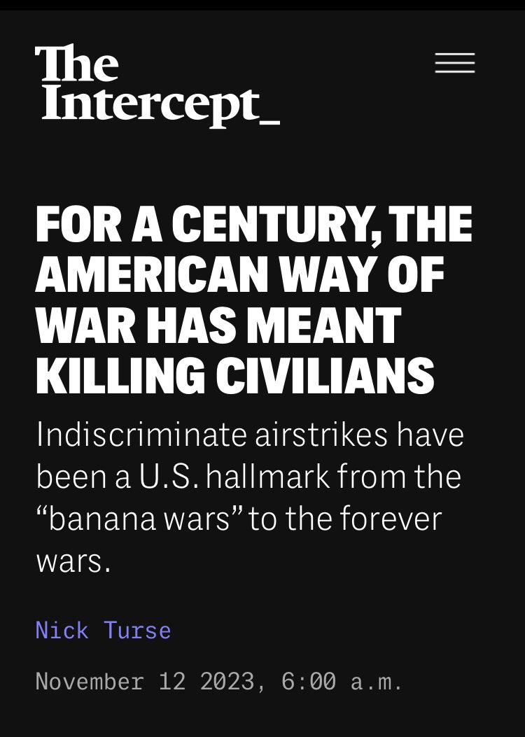 مقال في موقع إنترسبت/The Intercept يتناول كيف أن تاريخ #الولايات_المتحدة_الأمريكية الطويل في استهداف المدنيين والتساهل في قتلهم عن قصد، كان ملهما ومرجعا للكيان الصهيوني للسير على ذات الطريق، دون خشية المحاسبة، أو الخوف من التبعات.