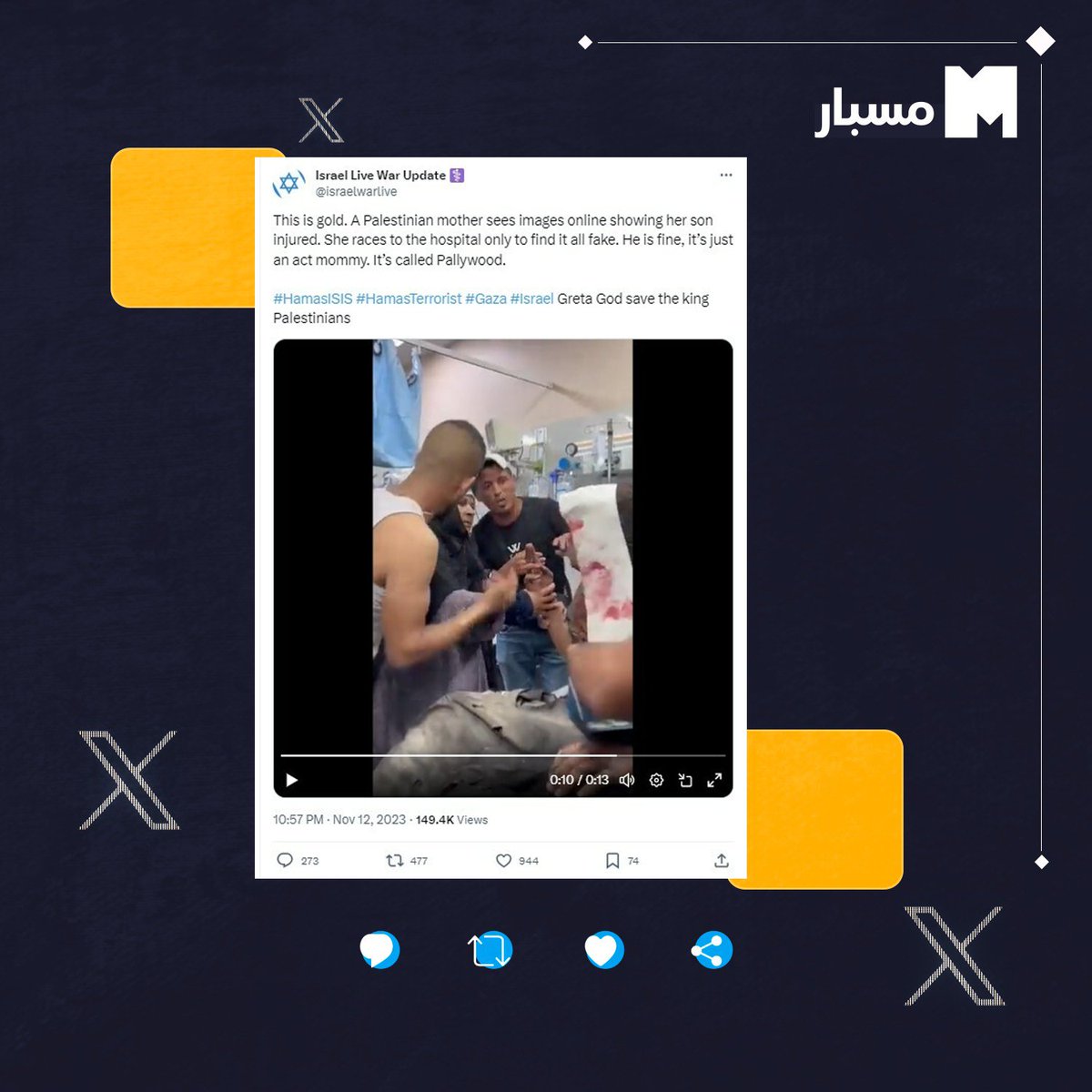⬅️ تستمر الحسابات الإسرائيلية بنشر مزاعم عن اختلاق الفلسطينيين لمعاناتهم وفبركة مشاهد الضحايا والجرحى رغم أنّ ضحايا القصف الإسرائيلي على القطاع تجاوز أكثر من 12 ألف فلسطينيًّا، منهم 5 آلاف طفل، فضلًا عن جرح ما يقارب 30 ألفًا، منذ بدء الحرب على #غزة.