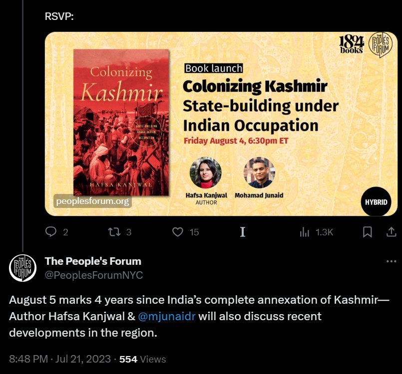 @DisinfoLab As recently as August 2023, The People's Forum was seen endorsing a book written by Hafsa Kanjwal titled ‘Colonising Kashmir: State Building under Indian Occupation.’
