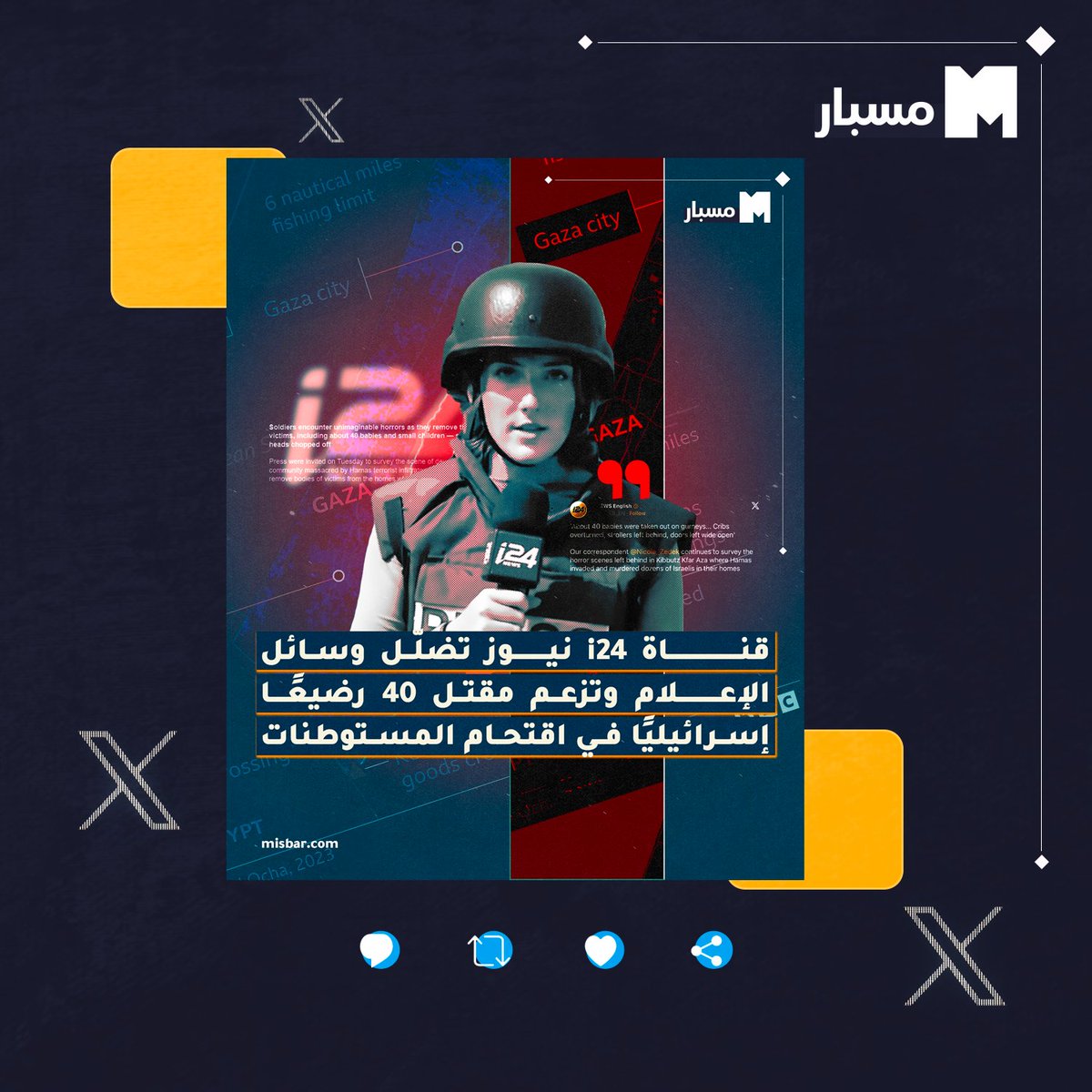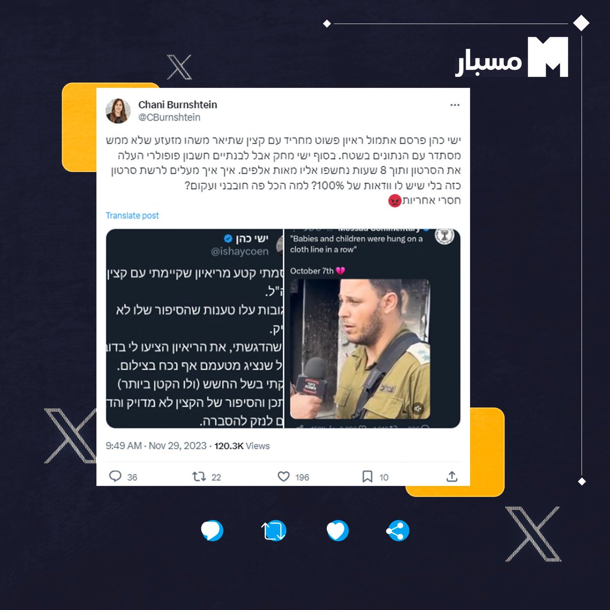⭕️وبمزيد من التحقق، وجد #مسبار أن الشخص الذي ظهر مع المراسل يشاي كوهين في المقابلة هو يارون بوسكيلا، مقدم إسرائيلي متقاعد، وما يزال يخدم في الخدمة الاحتياطية، وخدم في مناصب قيادية في الجيش الإسرائيلي بدءًا من مقـاتل حتى نائب قائد اللواء.