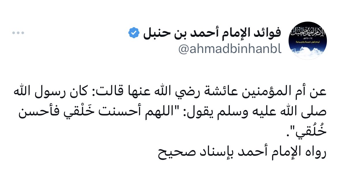 عن أم المؤمنين عائشة رضي الله عنها قالت: كان رسول الله صلى الله عليه وسلم يقول: "اللهم أحسنت خَلْقي فأحسن خُلُقي".