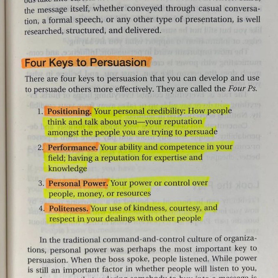 هذه العناصر الأربعة ضرورية للإقناع والقيادة الفعّالة، وتبرز أهمية السمعة والمهارة والتأثير والعلاقات الشخصية.