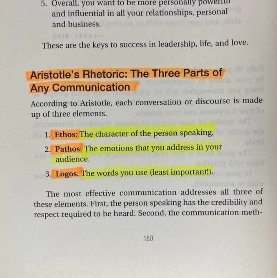 1. الإيثوس (Ethos): يتعلق بشخصية الشخص الذي يتحدث. يجب أن يكون لدى الشخص مصداقية وموثوقية ليتم الاستماع إليه.