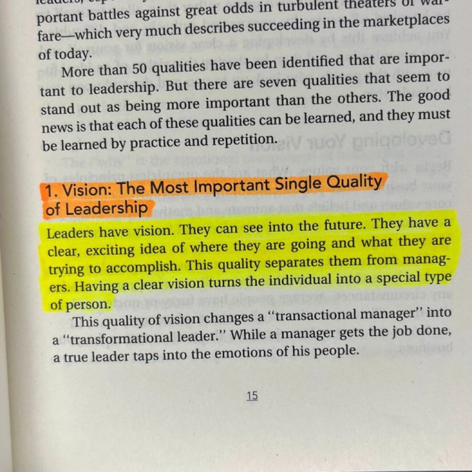 الرؤية هي أهم صفة فردية في القيادة. القادة لديهم رؤية؛ يمكنهم النظر إلى المستقبل ولديهم فكرة واضحة ومثيرة عما يريدون تحقيقه. هذه الصفة تفصلهم عن المديرين. الرؤية الواضحة تحول الفرد إلى نوع خاص من الشخص.