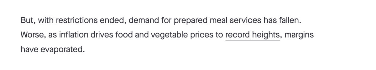 أدى التضخم الذي تعيشه الولايات المتحدة الأمريكية إلى ارتفاع تكاليف إعداد الوجبات الصحية وهذا أدي إلى رفع أسعار الوجبات ومن ثم قاد الشركة نحو انخفاض عدد المشتركين وكذاك انخفاض هوامش الربح وهذا هو السبب الذي قضى على الشركة