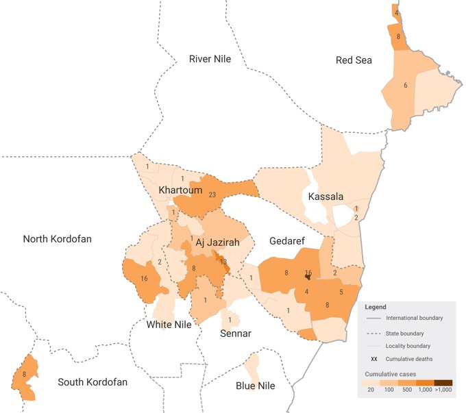 حتى الآن تفشى وباء الكوليرا في تسع ولايات بالسودان، مما أصاب أكثر من 5,100 شخص وأدى الى وفاة أكثر من 160، أكثر الولايات تفشي هي ولايتي القضارف و ولاية الجزيرة.