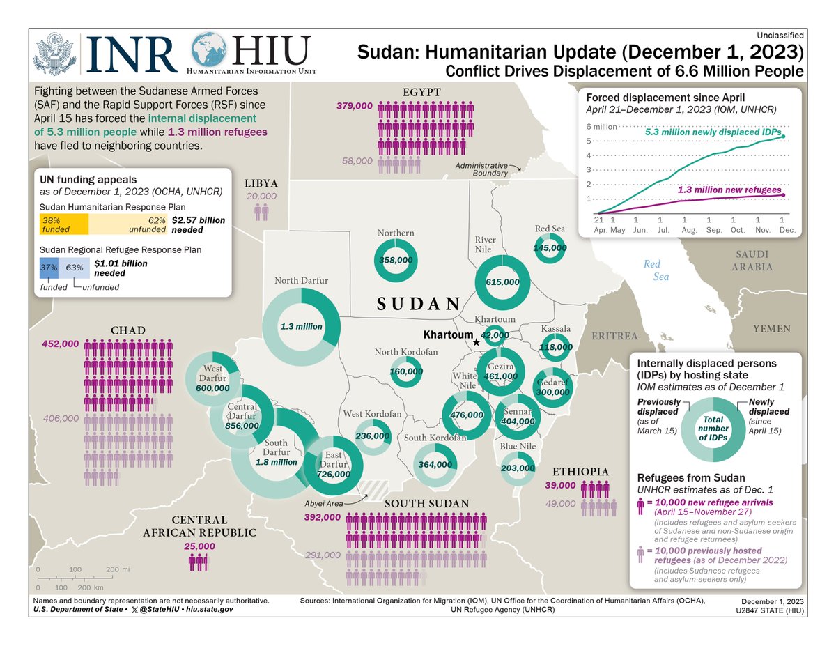 بحسب احصائيات رسمية بلغ عدد النازحين داخل السودان وخارجه منذ منتصف أبريل 6.3 مليون شخص، نزح حوالي 5.1 مليون شخص داخل السودان، وقد نزح الأشخاص في 5,473 موقعًا في جميع الولايات الثماني عشرة.