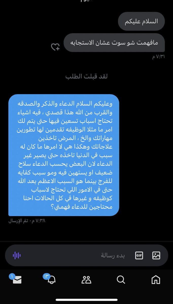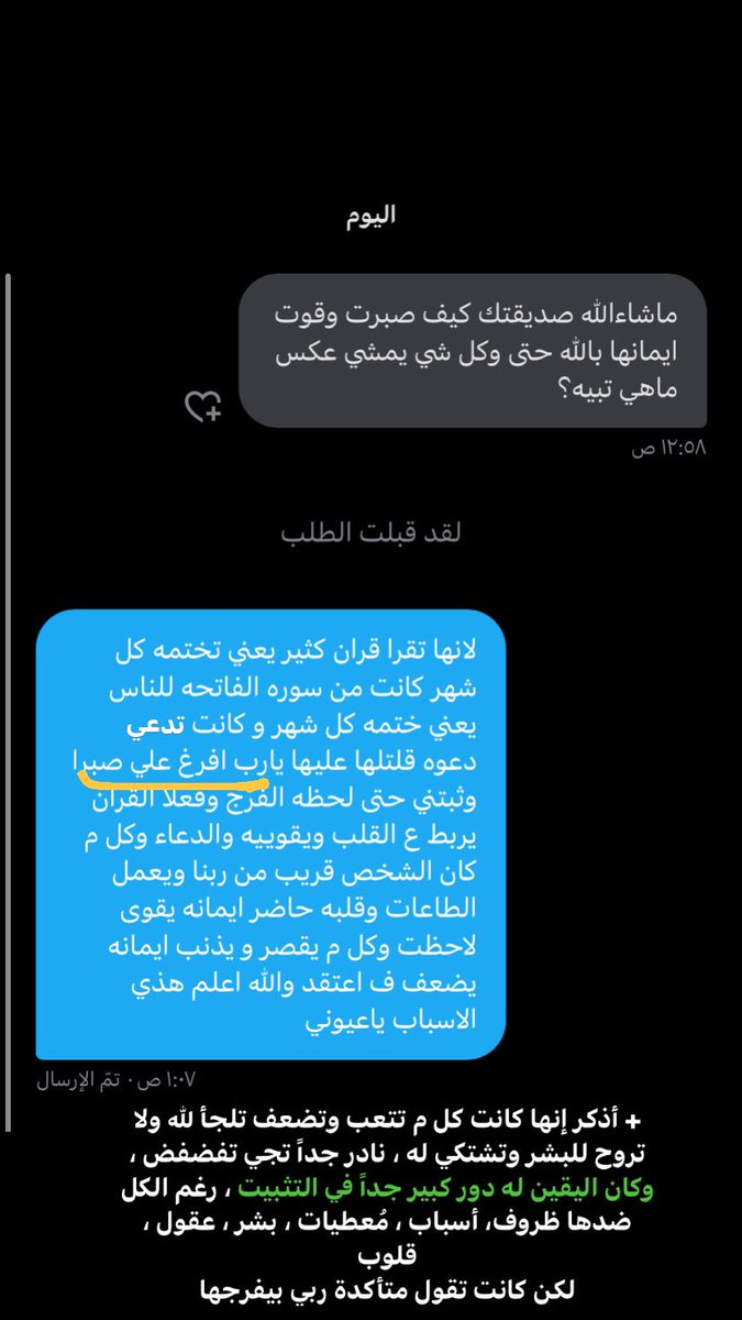 ولاحظت الفرق جداً مع اليقين ف استجابه الدعاء اي ربنا يستجيب حتى لو يقينك نزل بسبب ظروف خارجه عنك لكن لاحظت مع اليقين م تحس ف الوقت وتحسه بسرعه استجاب لذلك اسعوا يكون الدعاء يكون بثقه ف الله و اذكروا الله كثير وتصدقوا، ومو شرط تطول مده الاستجابه انا اعطيكم امثله لكل شخص قدره❤️