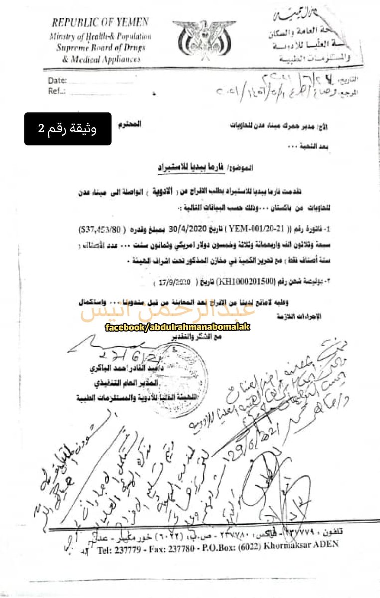 في تاريخ 5 يوليو 2021 وجه العميد عبدالسلام العمري مدير عام شرطة المنطقة الحرة خطابا الى مدير عام الهيئة العليا للادوية بعدن ، كان مضمون المذكرة : (( نرجو منكم اعادة النظر في الافراج وامر التحريز فقد تغيرت الوان الاصناف الطبية جراء تعرضها لدرجة حرارة عالية )) "انظر الوثيقة رقم 3" ، لكن هيئة الادوية تصر على الافراج تحت ذريعة ان كمية الحاوية المقدرة بعشرات الاف الباكتات بين قوارير وامبولات واشرطة، ستحرز في مخازن الشركة المستوردة.