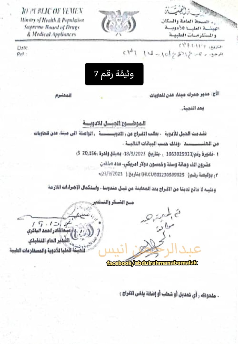 كما حصلنا على صورة من مذكرة وجهتها الهيئة الى مدير جمرك الميناء تطلب فيها الافراج عن الحاوية المذكورة وعليها توقيع مندوب الهيئة بان الادوية مطابقة للمواصفات !!. "انظر الوثيقة رقم 7"