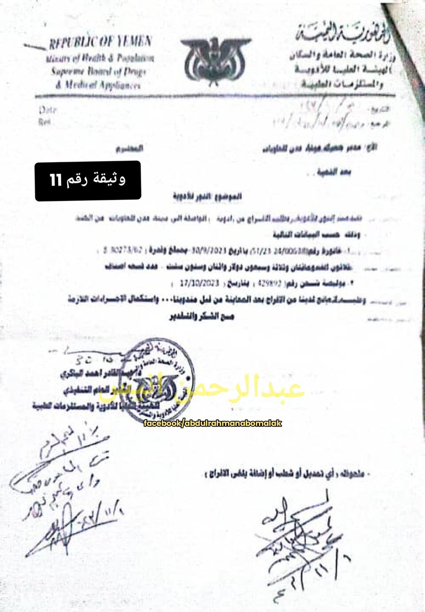 كما عثرنا على محضر اثبات حالة بتاريخ 1 نوفمبر 2023 يفيد ايضا بمعاينة وتفتيش حاوية نوع حديد غير مثلجة تحتوي على ادوية بشرية واصلة من الهند ، باسم المستورد / معمل النور للادوية ، "انظر الوثيقة رقم 10" ، وتم صرف شهادة افراج للادوية من قبل الهيئة العليا للادوية ايضا !!."انظر الوثيقة رقم 11".
