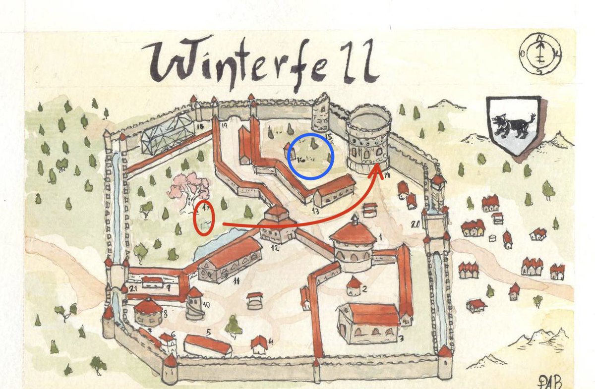 مع اني ارشح ان شبح وينترفيل هو ثيون لكن ما اعتقد انه ارتكب كل الجرائم، لكن قتل والدر الصغير كانت فعلته لان النساء اللي مع مانس رايدر انكروها، هذا مكان تواجد ثيون (بالاحمر) وكان رايح للقلعة حتى يقابل روان، (والازرق) نفس مكان عثورهم على جثة الطفل، وماننسى ثيون ماعنده مشكلة بقتل طفل