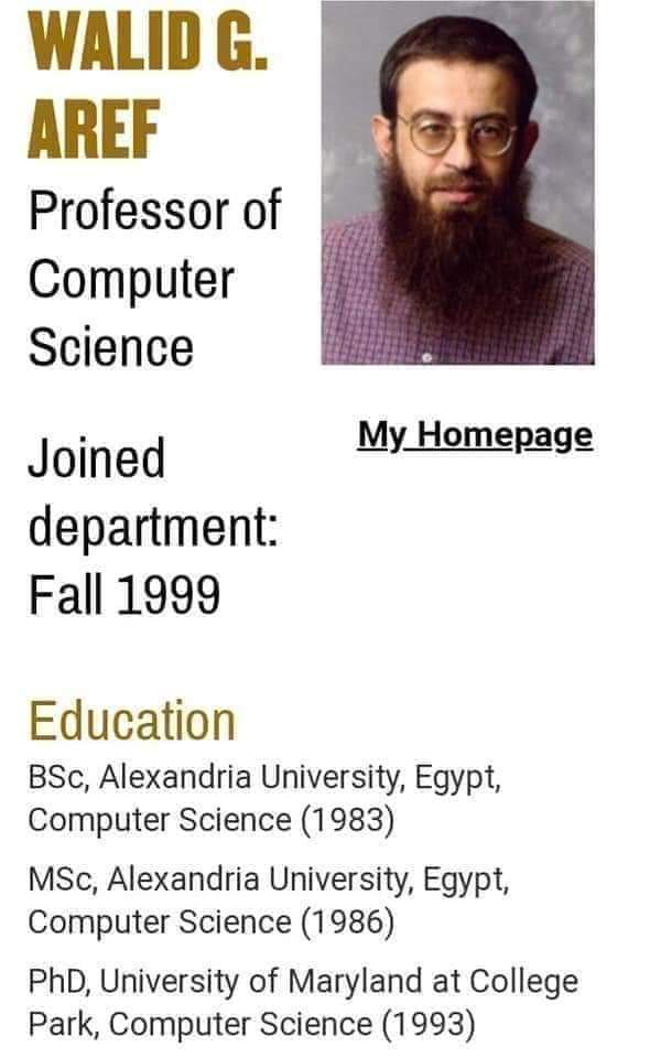 وليد . عارف أستاذ علوم الكمبيوتر في جامعة بوردو. في عام 2001 ، حصل على جائزة CAREER من المؤسسة الوطنية للعلوم وفي 2004 حصل على بوردو جائزة منحة أعضاء هيئة التدريس بالجامعة. وليد هو عضو في CERIAS بوردو. وهو رئيس تحرير معاملات ACM للخوارزميات والأنظمة المكانية (ACM TSAS) ، عضو في هيئة تحرير مجلة Journal of Spatial Information Science (JOSIS) ، وعمل كمحرر لمجلة VLDB Journal و ACM Transactions of Database Systems (ACM TODS). فاز وليد بالعديد من أفضل الجوائز الورقية بما في ذلك جائزة VLDB لأفضل ورقة مدتها عشر سنوات. هو زميل IEEE ، وعضو في ACM. بين عامي 2011 و 2014 ، عمل وليد كرئيس لمجموعة ACM ذات الاهتمام الخاص بشأن المعلومات المكانية (SIGSPATIAL).