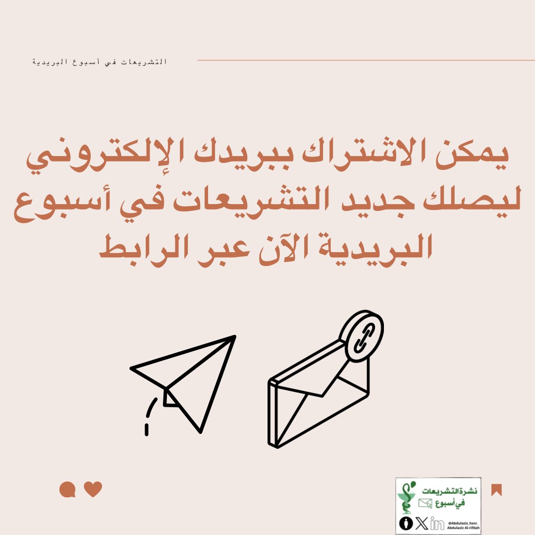 يمكنك ذلك الآن بمتابعة نشرة التشريعات في أسبوع وذلك بتسجيل بريدك الإلكتروني ليصلك صباح كل يوم أحد عبر الرابط 📫