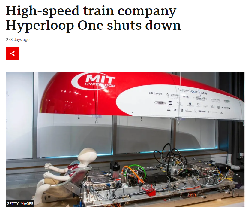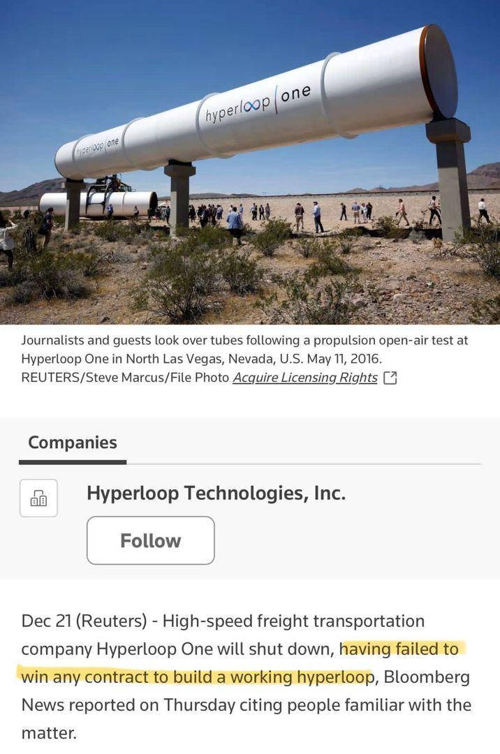شركة Hyperloop one التي تأسست في 2014 قالت بأنها ستغلق بنهاية هذا العام 2023 وأعلنت أن سبب الإغلاق عدم حصولها على أي عقد لبناء مشروع هايبرلووب.