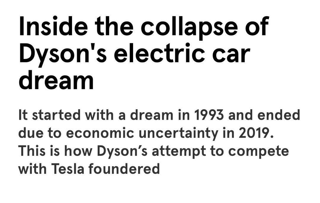 شركة Dyson's electric أطلقت مشروع السيارة الكهربائية عام 1993 لكنه لم يرى النور لأسباب تمويلية، لكن مفهوم السيارات الكهربائية لم ينتهي بل تطور ونجح نجاح كبير اليوم.