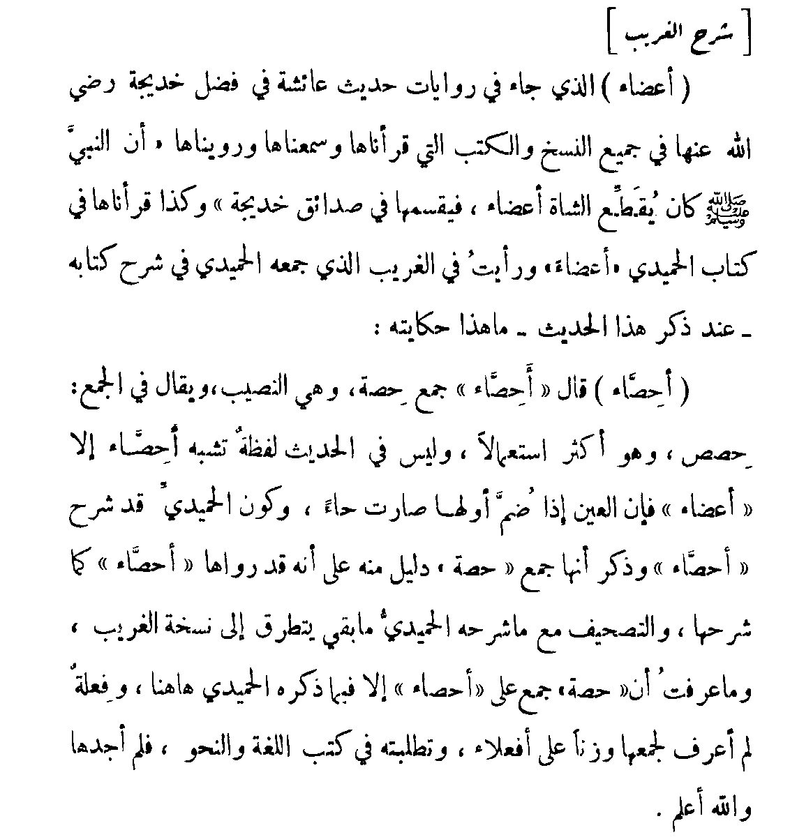٥- عند ذكر هذا الحديث ما هذا حكايته: أحصاء قال: أحصاء جمع حصة وهي النصيب، يقال في الجمع: حصص، وهو أكثر استعمالا، وليس في الحديث لفظة تشبه أحصاء إلا أعضاء، فإن العين إذا ضم أولها صارت حاء، وكون الحميدي قد شرح أحصاء وذكر أنها جمع حصة، دليل منه على أنه قد رواه أحصاء كما شرحها