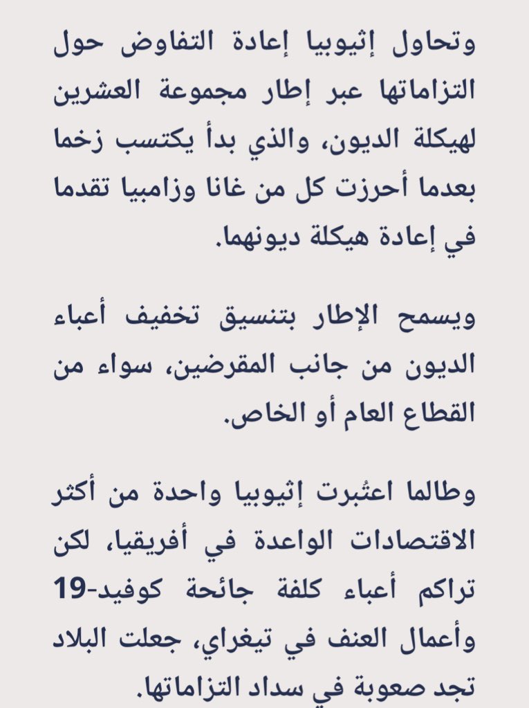 المأسوفة على شبابها اثيوبيا مديونة وبتتشرط على الدائنين (يا اما يأجلوا الدين يا اما تمتنع عن السداد) بحجة تطابق مواصفات حالتها مع الدول الفقيرة اللي استفادت