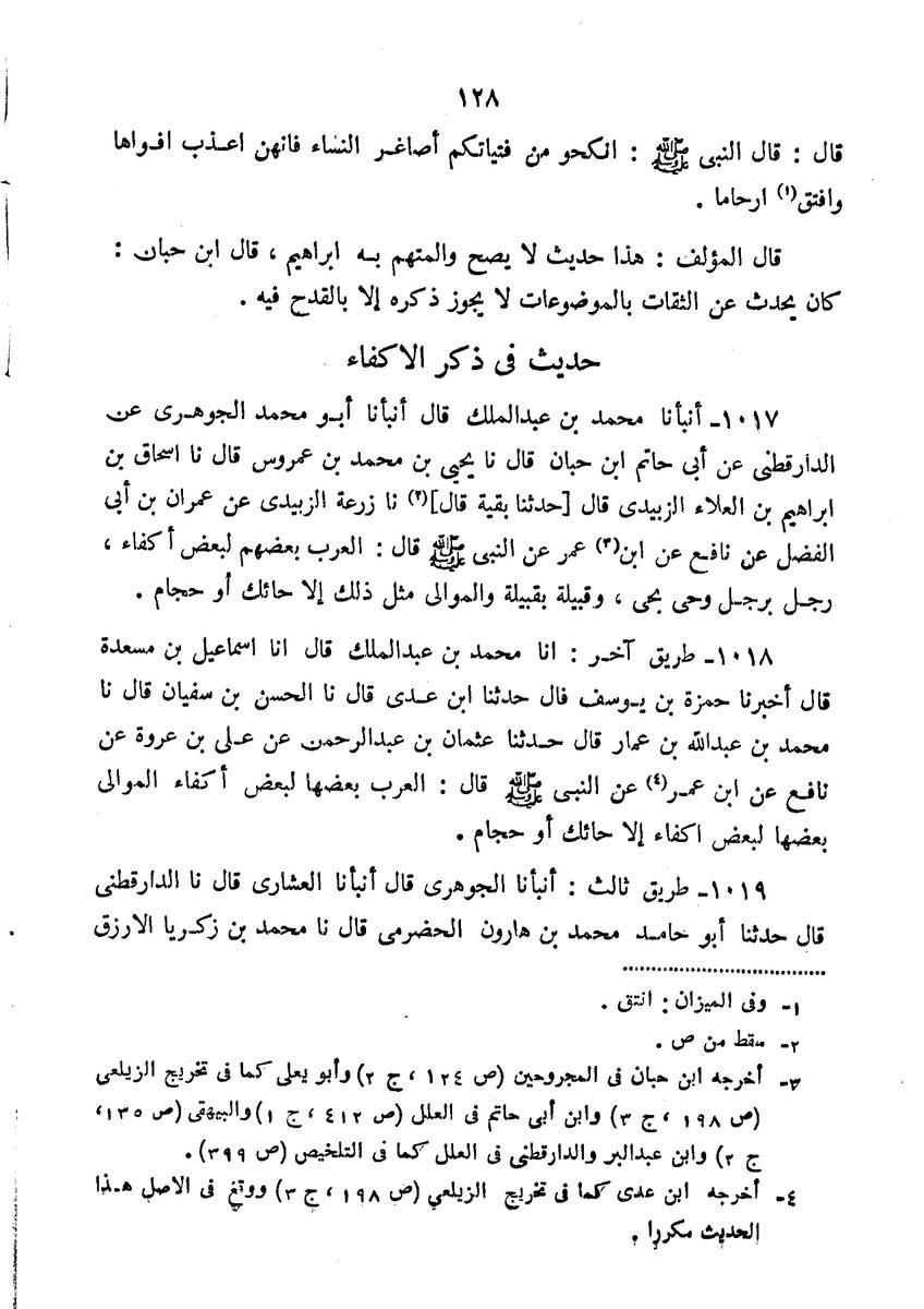 (التحقيق مختصر) الطريق الأول حدثنا إبراهيم حدثنا محمد حدثني عبد الرحمن عن أبيه عن جده قال رسول الله عليكم بالأبكار فإنهن أعذب أفواها وأنتق أرحاما وأرضى باليسير تالف